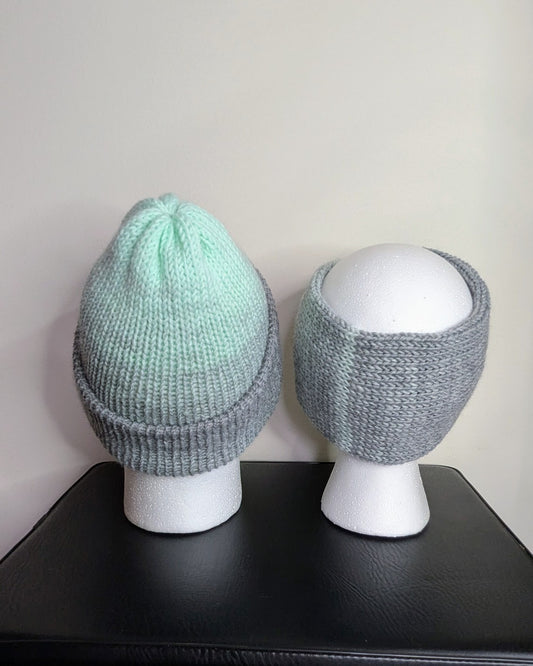 Same Skein Double Knit Hat & Headband Set (Mint & Gray)