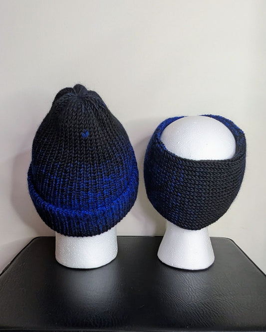 Same Skein Double Knit Hat & Headband Set (Blue & Black)