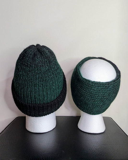Same Skein Double Knit Hat & Headband Set (Green & Black)